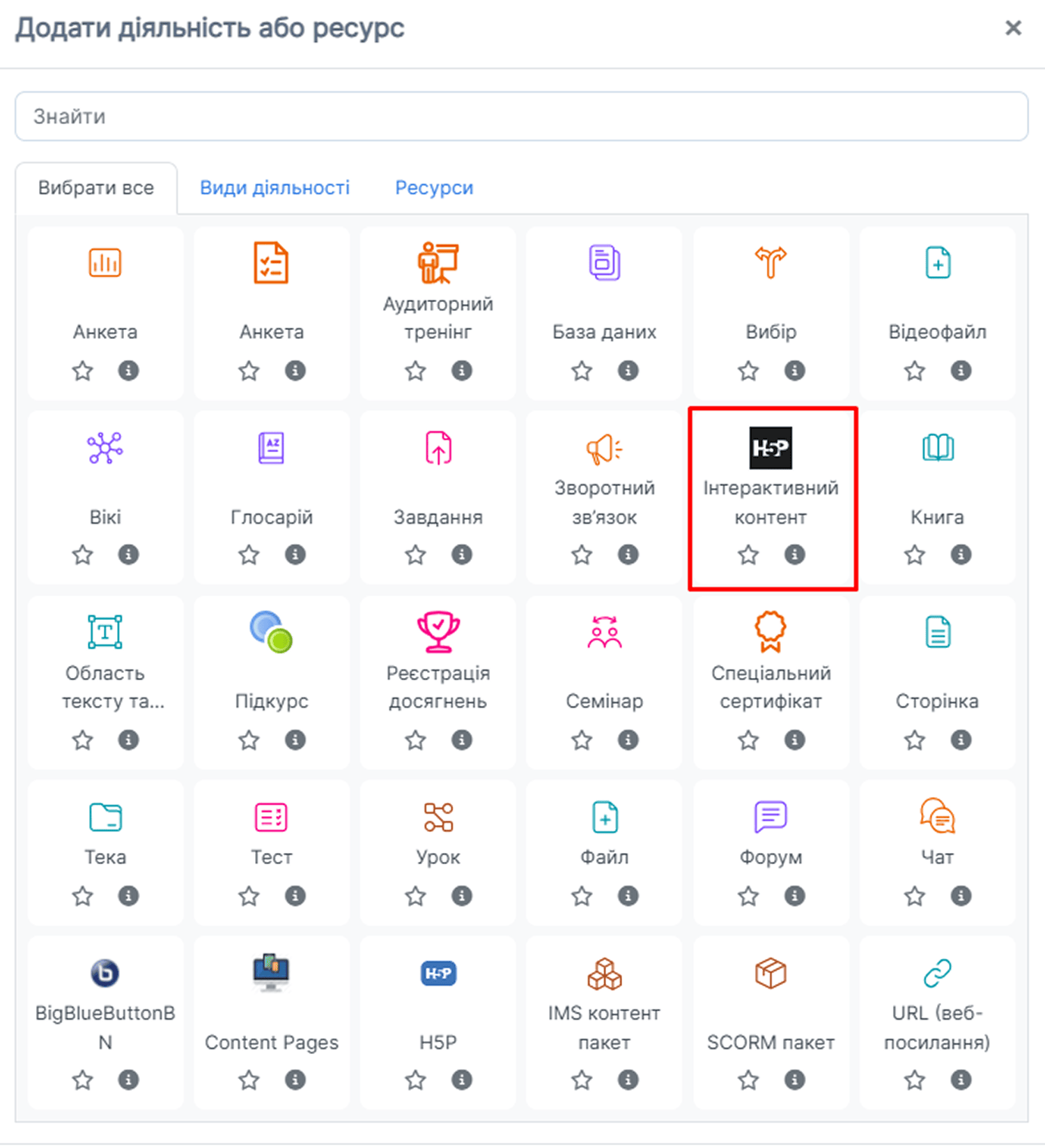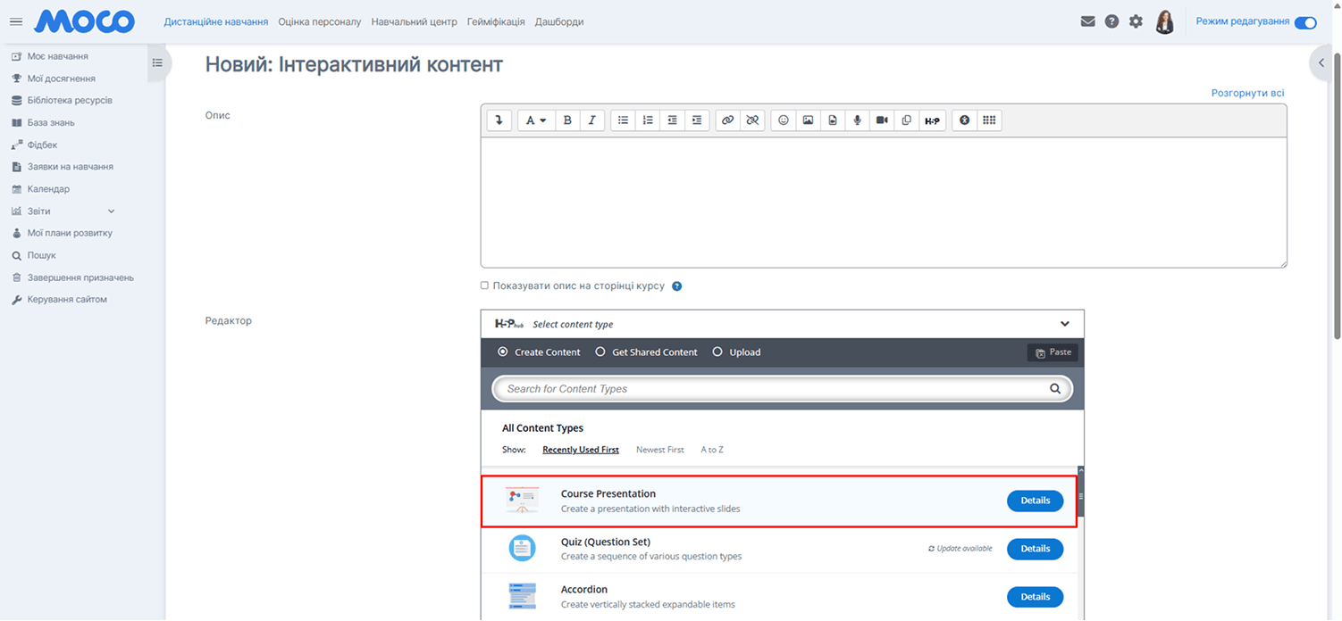 Щоб створити інтерактивну презентацію, увімкніть режим редагування у вашому курсі в Moco LMS, натисніть кнопку «Додати діяльність або ресурс», виберіть «Інтерактивний контент (H5P)», а потім у списку доступних типів контенту знайдіть і оберіть Course Presentation.
