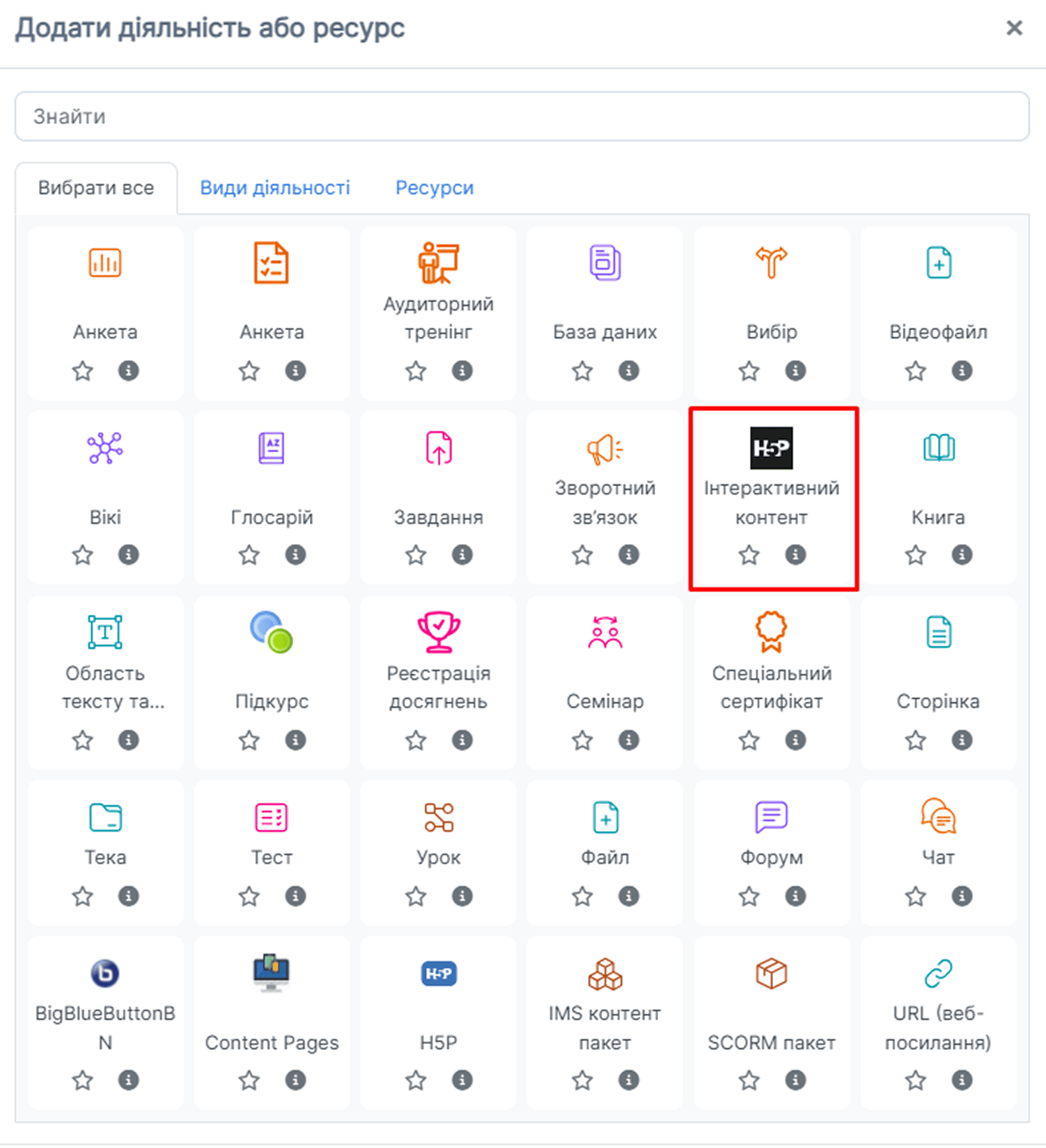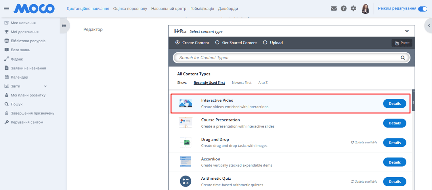 Щоб створити інтерактивне відео, увімкніть режим редагування у вашому курсі в Moco LMS, натисніть кнопку «Додати діяльність або ресурс», виберіть «Інтерактивний контент (H5P)», а потім у списку доступних типів контенту знайдіть і оберіть Interactive Video.