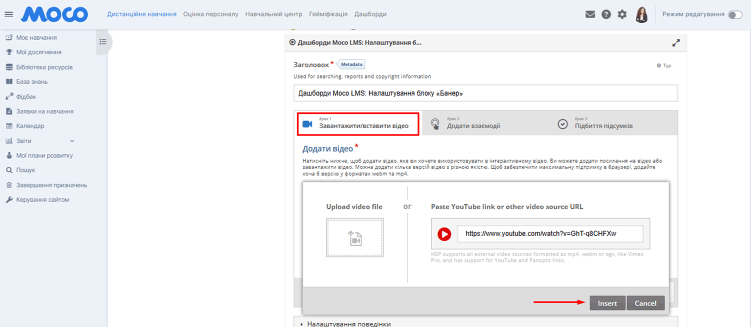 • Вставити посилання на YouTube або Vimeo (найоптимальніший варіант для економії місця в LMS).