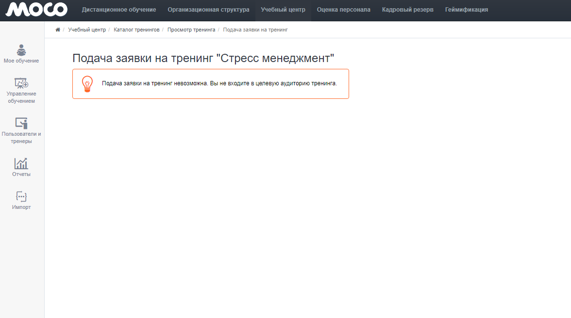Якщо користувач не входить до цільової аудиторії тренінгу, то при спробі подати заявку йому буде виводитись повідомлення “Подача заявки на тренінг неможлива. Ви не входите до цільової аудиторії тренінгу”.